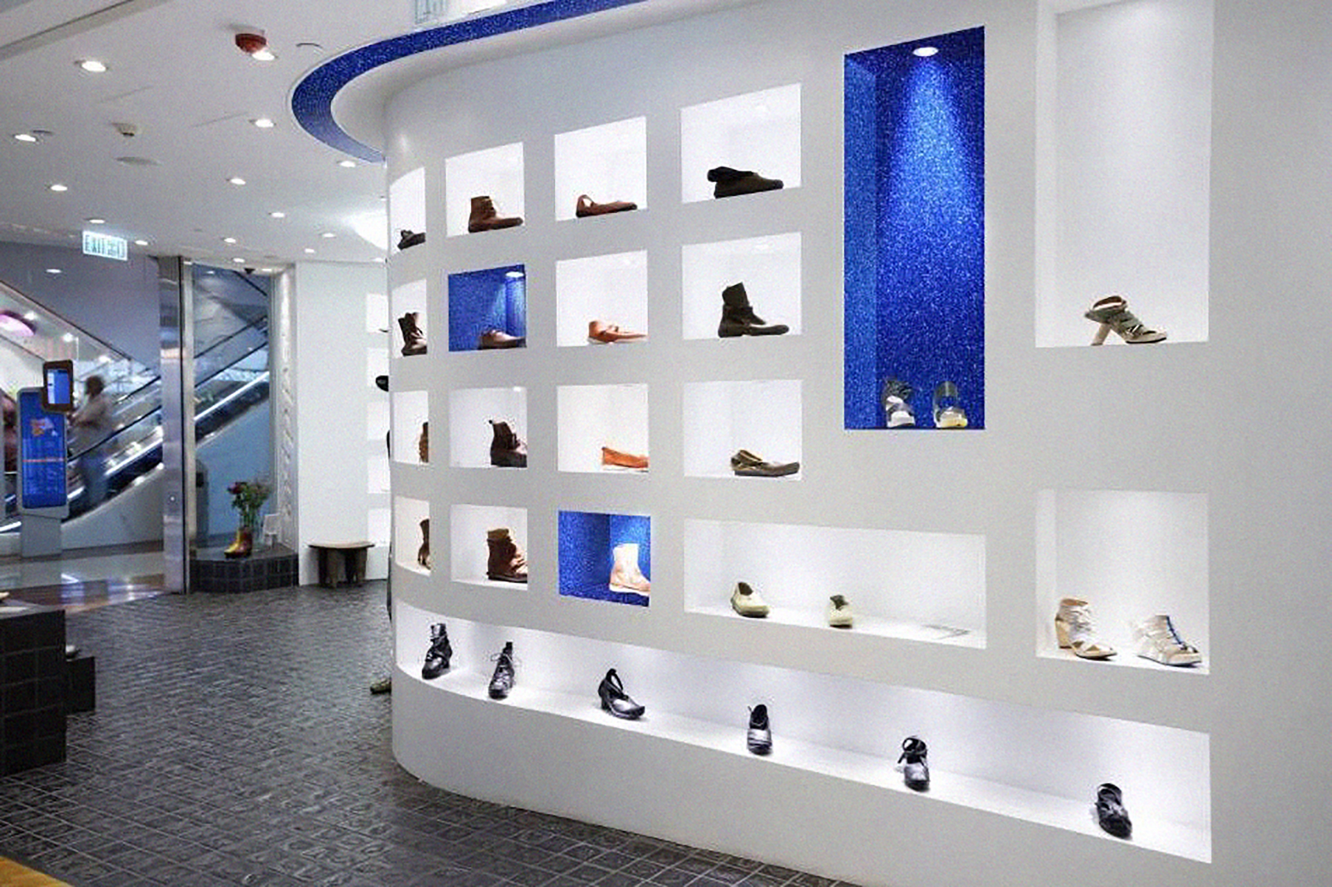 - Un contraste saisissant : Le film bleu scintillant utilisé dans certaines niches d’exposition apporte une touche de dynamisme et de modernité, tout en créant un contraste marqué avec le blanc épuré des autres sections. Ce choix audacieux met immédiatement en valeur les produits exposés dans ces espaces.